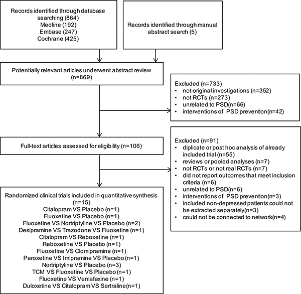 To compare the safety and efficacy of different drugs for PSD treatment, we captured RCTs published in English and up to March 1, 2017, and compiled from the following databases: PubMed, Embase and the Cochrane Library Central Register of Controlled Trials (CENTRAL). We manually screened references from published systematic reviews in the discipline and retrieved trials. A modified search algorithm for each database was adapted (Appendix 2).