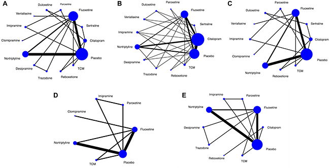 Figure 2: Network of eligible comparisons. The width of the lines is proportional to the number of trials comparing every pair of treatments, and the size of every circle is proportional to the number of randomly assigned participants (sample size). TCM = Traditional Chinese Medicine. (A) Network of eligible comparisons for efficacy after treatment completion. (B) Network of eligible comparisons for efficacy of four-week duration. (C) Network of eligible comparisons for efficacy of eight-week duration. (D) Network of eligible comparisons for response rate. (E) Network of eligible comparisons for tolerability.