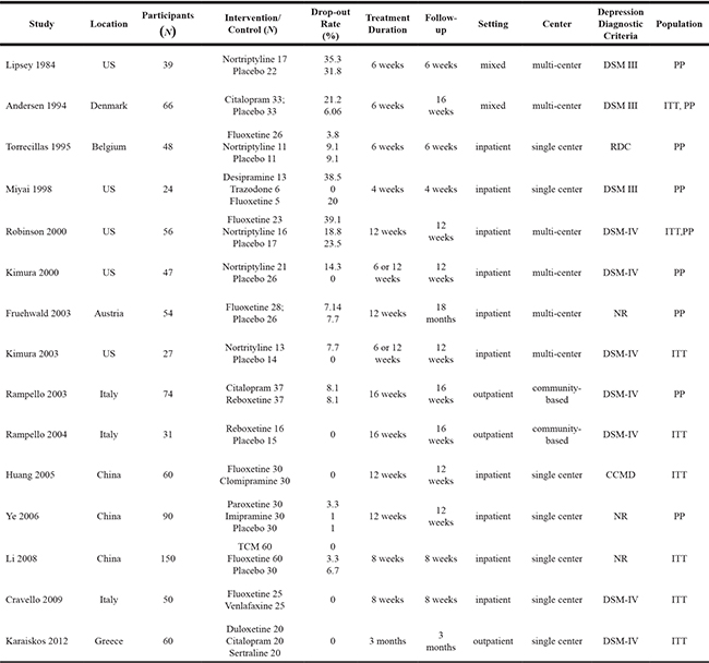 DSM = Diagnostic and Statistical Manual of Mental Disorders; DSM-IV-TR = Diagnostic and Statistical Manual of Mental Disorders fourth edition, text revision; RDC = Research Diagnostic Criteria; CCMD = Chinese Classification of Mental Disorder; TCM = traditional Chinese medicine; CES-D = center of epidemiological survey depression scale; NR = not reported; PP = per protocol; ITT = intention to treat.