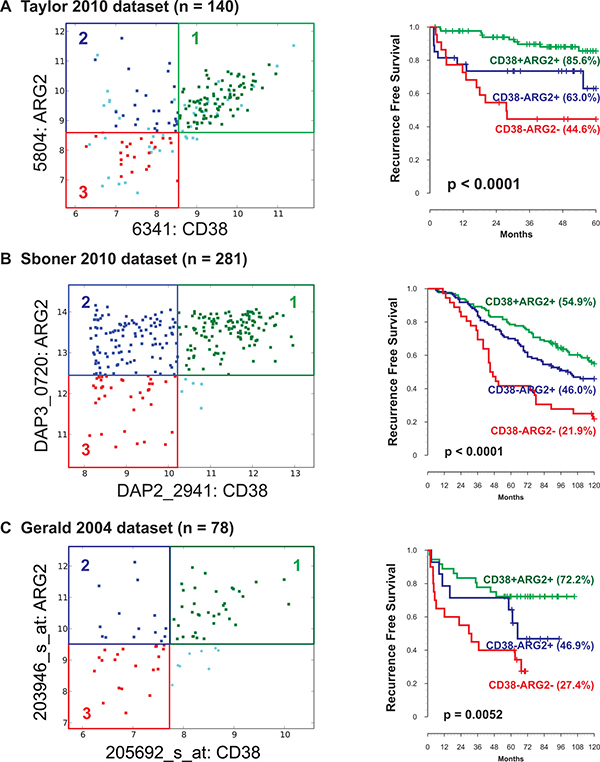 Figure 3: Association of ARG2 and CD38 transcript levels with patient outcome. Three prostate cancer differentiation states ARG2+CD38+, ARG2+CD38-, and ARG2-CD38- were identified in three independent datasets. (A) Taylor-2010 dataset (n = 140). (B) Sboner-2010 dataset (n = 281). (C) Gerald-2004 dataset (n = 78). In all datasets (total n = 499), CD38-ARG2- groups were associated with lowest, CD38-ARG2+ groups were associated with moderate, and CD38+ARG2+ groups were associated with highest 10-year recurrence-free survival.