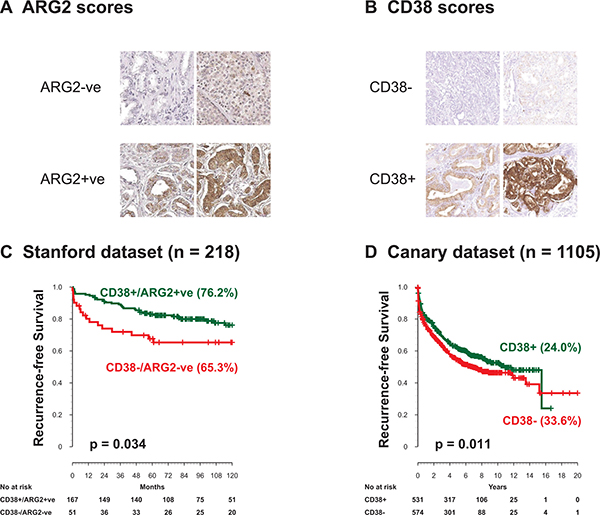 Freshly cut 5 micron sections were obtained and immunohistochemistry was performed using a commercial antibody to CD38 (CD38-290-L-CE, 1:25, Leica (Novocastra)) by the Department of Pathology Immunodiagnostic Laboratory using standard optimized protocols. ARG2 expression was assessed by IHC using a commercial antibody (SC20151, 1:50, Santa Cruz Biotechnology Inc., Santa Cruz, CA). Cancer cores were scored on a 0–3 scale based on staining intensity where negative was 0, weak 1, moderate 2 and strong 3 (described in Supplementary Figure 2 and 3). In the Stanford cohort, ARG2 was scored based on the percentage of positively stained tumor cells as described in Supplementary Figure 4: 0 – 1% positive (score 0), 1 – 33% positive (score 1), 33 – 66% positive (score 2), 66 – 95% positive (score 3), and greater than 95% positive (score 4). Because of the large number of cases and cores, ARG2 percentage scoring was not performed in the Canary TMA cohort. The CD38 IHC score used in the analysis was the maximum score of all the cores from that patient and the ARG2 IHC was the minimum score of all the cores from that patient. Strong/moderate scores (score 3 and 2) were considered positive, and weak/negative scores (score 1 and 0) were considered negative. For the Stanford cohort, ARG2 percent was used. ARG2 negative (ARG2 –ve) score was computed by combining raw ARG2 percentage score 0, 1, and 2. ARG2 positive (ARG2 +ve) score is computed by combining raw ARG2 percentage score 3 and 4. In the Stanford cohort, 216 patients had high-quality CD38 staining and 219 patients had high-quality ARG2 staining available for analysis. A combined CD38/ARG2 score was generated such that patients were scored “CD38-/ARG2-ve” if the ARG2 score was 0 or 1 or ARG2 score was 2 and CD38 score was 0 or 1. Patients were scored “CD38+/ARG2+ve” if ARG2 score was 3 or 4 or ARG2 score was 2 and CD38 score was 2 or 3.