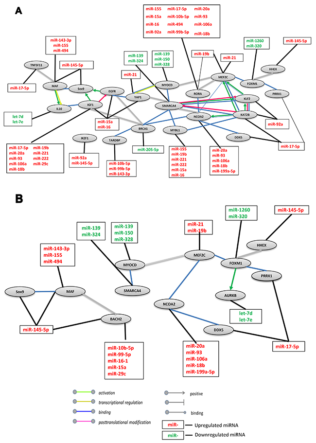 Figure 4: Network interaction between miRs and their target genes involved in RNA Polymerase II Promoter regulation in DLBCL. (A) Positive regulation network. The gene group (GO:0045944) was taken from Gene Ontology annotations analysis. The STRING interaction database used high confidence interaction (0.7) between closed genes to create the network of targets in DLBCL. (B) Negative regulation network. The gene group (GO:0000122) was taken from Gene Ontology annotations analysis. The STRING interaction database used high confidence interaction (0.8) to generate the network targets in DLBCL. Up and downregulated updated miRs were added to the network.