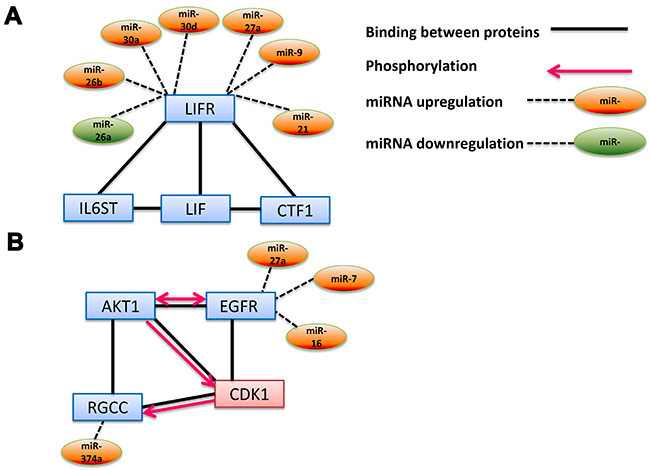 Another interesting biological process detected by our GO analysis (highest score, 14.73, Supplementary Table 3B) is “Positive Regulation of Cyclin-dependent Protein Serine/threonine Kinase Activity Involved in G1/S Transition of Mitotic Cell Cycle” (GO:0031659). Our analysis revealed that miRs-374a, 27a, 7 and 16 regulate two genes that are involved in this pathway: regulator of cell cycle (RGCC) and endothelial growth factor receptor (EGFR). These two factors, together with the murine thymoma viral oncogene homolog (AKT1) bind cyclin-dependent kinase 1 (CDK1). Moreover, phosphorylation-dependent activity was also found between the proteins in the complex [46–50]. This complex plays an important role in cell cycle control, whereas its deregulation could accelerate tumor growth [51].