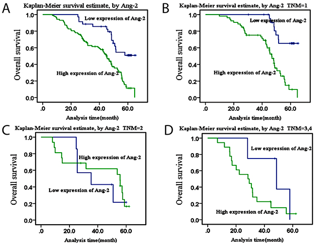 Figure 2: Kaplan-Meier survival curves of Ang-2 overexpressionThe survival curves of high Ang-2 expression in patients with lung cancer were made by the Kaplan-Meier method. (A), the overall survival curve of high Ang-2 expression in patients with lung cancer; (B), the overall survival curve of high Ang-2 expression in patients with lung cancer at TNM stage I; (C), the overall survival curve of high Ang-2 expression in patients with lung cancer at stage II; and (D), the overall survival curve of high Ang-2 expression in patinets with lung cancer at stage III-IV, respectively.