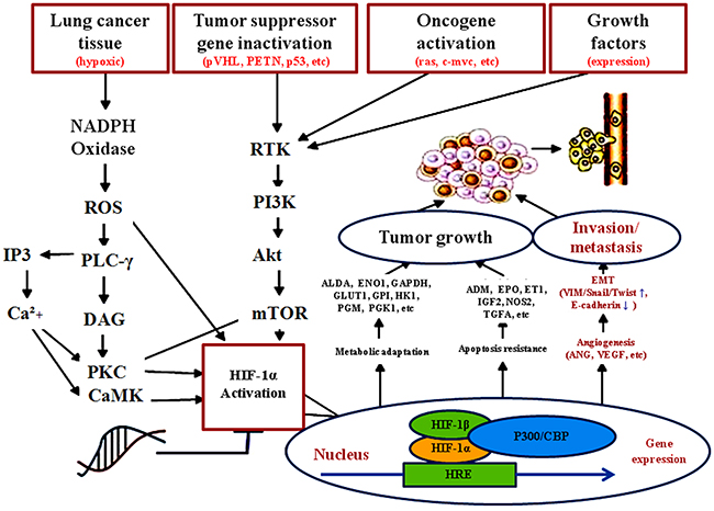 Figure 5: Possibility mechanism of tumor derived Ang-2 up-regulating EMT and facilitating lung cancer metastasis. Ang-2 has been implicated in mediating inflammatory processes, and upregulated in multiple inflammation-related tumors or signaling pathway. With lung cancer volume increasing, intratumoral hypoxia in the absence of vascularization resulted in tumor cells to express Ang-2 inducing angiogenesis for tumor growth and increasing vascular permeability. Overexpression of Ang-2 facilitating proliferation, invasion, metastasis, and EMT of lung cancer cells that could be a new mechanism insight into tumor metastasis by inhibiting E-cadherin and upregulating VIM, Twist and Snail signaling. Ang, angiopoietin; Ang-2, angiopoietin-2; CaMK, calcium/calmodulin-dependent protein kinase; EMT, epithelial-mesenchymal transition; ENO1, enolase 1; EPO, erythropoietin; ET1, endothelin-1; GAPDH, glyceraldehyde-3-phosphate dehydrogenase; Glut1, glucose transporter 1; HIF-1α, hypoxia-inducible factor-1α; HK1, hexokinase 1; HRE, hypoxia-response element; IGF2, insulin-like growth factor 2; IP3, inositol 1,4,5-trisphate; mTOR, mechanistic target of rapamycin kinase; NOS2, nitric oxide synthase 2; Oncogenes, ras, c-myc etc; PLC-γ, phospholipase C gamma; PI3K, phosphatidylinositol 3-kinase; PKC, protein kinase C; RTK, receptor tyrosine kinase; TGFA, transforming growth factor alpha; tumor suppressor genes, pVHL, P53, PTEN, etc. VEGF, vascular endothelial growth factors; VHL, von Hippel-Lidau; VIM, Vimentin.