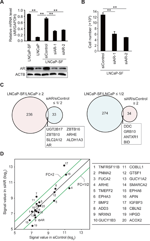 Figure 1: Effect of AR silencing on gene expression and growth in LNCaP-SF cells. (A) Representative qPCR and immunoblot showing that siRNA-mediated AR knockdown effectively reduced AR mRNA and protein expression in LNCaP-SF cells. (B) The growth rate of LNCaP-SF cells under androgen deprivation conditions was significantly reduced by siAR transfection. (C) Venn diagram showing the overlap of genes differentially expressed in LNCaP-SF/LNCaP cells compared with siAR-regulated transcripts in LNCaP-SF cells. Probe sets labeled light magenta were upregulated, while those labeled light cyan were downregulated. (D) Scatter plot analysis of gene expression differences between siRNA control and siAR. The top 20 differentially expressed genes in LNCaP-SF/LNCaP are listed in the right panel; the AR signal value is plotted between the siRNA control and siAR-treated LNCaP-SF cells. FC: fold change. Data represent mean ± s.e.m. **P < 0.01.