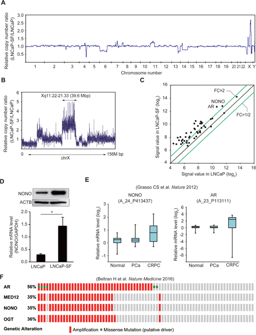 Figure 2: Amplification of the NONO gene in LNCaP-SF cells and CRPC samples. (A) Relative DNA copy number profile of LNCaP-SF cells. (B) Relative DNA copy number of chromosome X. Amplification of chromosome Xq11.22-q21.33 was observed in LNCaP-SF cells. (C) Scatter plot analysis of genes on chromosome Xq11.22-q21.33 showing expression differences between LNCaP-SF and parental LNCaP cells. (D) LNCaP-SF cells show increased p54nrb/NONO mRNA and protein expression. (E) Relative p54nrb/NONO and AR mRNA expression in PCa, CRPC, and normal tissue samples from the Grasso et al. data set (39). p54nrb/NONO mRNA expression was upregulated in CRPC. (F) Frequency of amplification (red bar) and mutation (green bar) for AR, MED12, OGT, and NONO in the Beltran et al. data set (cBioportal; http://www.cbioportal.org) (40). The percentages shown reflect the overall rate of gene amplification and mutation. Vertical aligned bars indicate samples from the same patient. Data represent mean ± s.e.m.