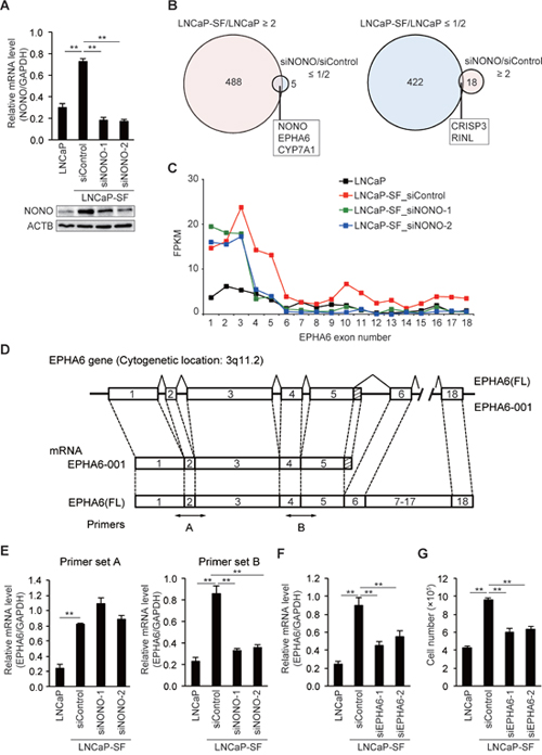 Figure 3: p54nrb/NONO mediates differential splicing of the EPHA6 gene. (A) Representative qPCR and immunoblot showing that siNONOs effectively reduced p54nrb/NONO mRNA and protein expression in LNCaP-SF cells. (B) Venn diagram showing the overlap of transcripts differentially expressed in LNCaP-SF/LNCaP cells and siNONO-regulated transcripts. Transcripts labeled light magenta were upregulated, and those labeled light cyan were downregulated. (C) Fragments per kilobase of exon per million mapped fragments (FPKM) values of EPHA6 exons. Exons 1–5 were significantly increased in LNCaP-SF cells. p54nrb/NONO silencing specifically reduced the FPKM value corresponding to exons 4 and 5. (D) Schematic gene structure comparison between full length EPHA6 (FL) and its truncated splice variant EPHA6-001. Transcription of EPHA6-001 is initiated from the same first exon of the EPHA6 (FL) gene and the unique C-terminal sequence of 12 amino acids is encoded by an extended exon downstream of exon 5. Specific primer pairs across exons 1 to 3 (primer set A) and exons 4 and 5 (primer set B) are indicated. (E) Effect of siNONOs on EPHA6-001 expression in LNCaP-SF cells. siNONOs markedly reduced exons 4-5 of mRNA EPHA6 expression in LNCaP-SF cells (data obtained using the primer set B). (F) Effect of EPHA6 common (siEPHA6-1) and EPHA6-001 specific (siEPHA6-2) siRNAs on EPHA6-001 expression in LNCaP-SF cells. (G) Transfection with siEPHA6s significantly reduced the growth rate of LNCaP-SF cells under androgen deprivation conditions. Data represent mean ± s.e.m. **P < 0.01.