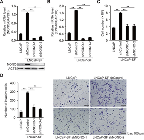 Figure 4: NONO silencing reduces LNCaP-SF cell growth and invasion. qPCR and immunoblot showing that levels of p54nrb/NONO (A) and EPHA6 (B) transcripts were efficiently reduced in LNCaP-SF cells after transduction with a lentivirus carrying two different shNONOs. (C) Transduction with shNONOs effectively reduced the growth rate of LNCaP-SF cells under androgen deprivation conditions. (D) Transduction with shNONOs significantly reduced the invasion ability of LNCaP-SF cells. A representative result of the cell invasion assay among the four groups of cells is shown. Data represent mean ± s.e.m. **P < 0.01.