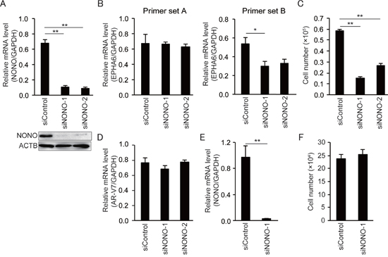 Figure 5: NONO knockdown inhibits growth of 22Rv1 cells but not of HUVECs. (A) Representative qPCR and immunoblot showing that siNONOs effectively reduced p54nrb/NONO mRNA and protein expression in 22Rv1 cells. (B) Transfection with siNONOs markedly reduced transcripts spanning exons 4 to 5 of EPHA6 in 22Rv1 cells (data obtained using EPHA6 primer set B). (C) Transfection with siNONOs significantly reduced the growth rate of 22Rv1 cells. (D) AR-V7 expression was not affected by siNONOs in 22Rv1 cells. (E) Reduced NONO mRNA expression in siNONO-1-transfected HUVECs. (F) No significant reduction of cell growth rate was observed in siNONO-1-transfected HUVECs. Data represent mean ± s.e.m. **P < 0.01.