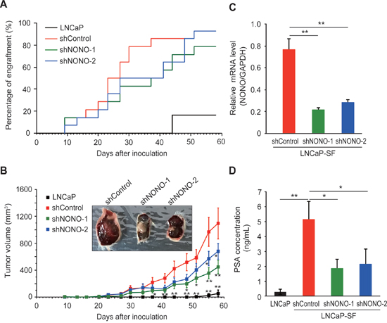 Figure 6: Effect of NONO silencing on LNCaP-SF tumor xenograft growth. (A) Effect of p54nrb/NONO shRNAs on engraftment ability of LNCaP-SF cells. Tumor engraftment was scored as positive when tumors were visually detected. (B) Effect of p54nrb/NONO shRNAs on LNCaP-SF tumor growth. (C) p54nrb/NONO shRNAs effectively downregulated NONO transcription in LNCaP-SF tumors. (D) Serum PSA levels were significantly reduced by shNONOs. Data represent mean ± s.e.m. *P < 0.05; **P < 0.01.
