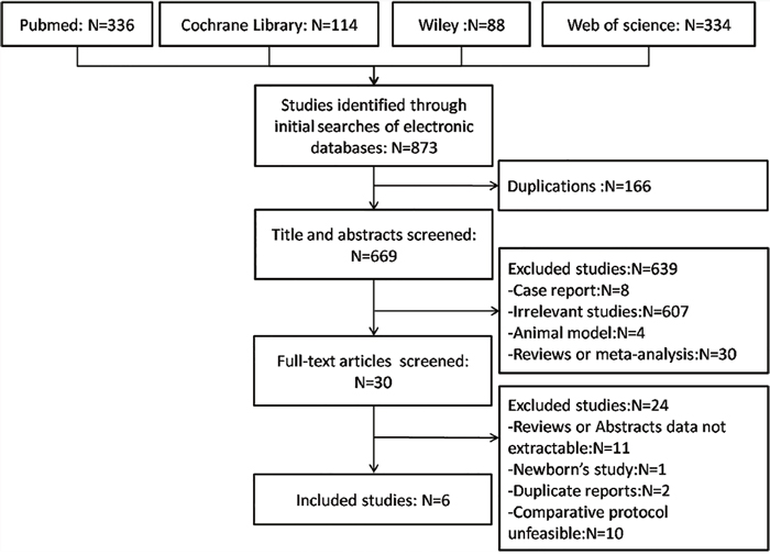 Details of the initial search results and refined inclusions are presented in Figure 1; a total of 873 references were identified from medical journal databases. After the removal of 166 duplicates and 699 exclusions, because their titles or abstracts described topics that were unsuitable for this study, 23 full-text articles were reviewed. Of these, four were reviews [17, 18] or only abstracts [15, 19], one was a duplicate report [20], one was a trial without related data pertaining to the outcome of an early orlate ileostomy closure [21], and a comparative protocol was unfeasible in 10 studies [22–31]. The remaining six studies [13, 14, 16, 32–34] that compared early with late closure ileostomy were included in the meta-analysis. An examination of references listed for these six studies and for review articles did not yield any further studies for evaluation. Agreement between the two reviewers was 83.3% for study selection and 83.3% for quality assessment of trials.