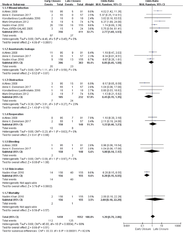 When data from the six studies were pooled, perioperative complications in 767 patients showed no significant difference between the early and late closure groups [9.4% and 7.6%, respectively; odds ratio (OR): 1.32; 95% confidence intervals (CI): 0.97–1.80; p = 0.08] (Figure 2). There was a higher prevalence of wound infection in the early closure group (16%; 57/356) than in the late closure group (6.57%; 27/411patients) (OR: 2.76; 95%CI: 1.70–4.50; p = 0.49; Figure 2). The early closure group also had a lower prevalence of obstruction (3.78%; 7/185) compared with that in the late closure group (10.3%; 24/232) (OR: 0.36; 95%CI: 0.15–0.86; p = 0.27; Figure 2). Anastomotic leakage and reoperation rates were available for three [13, 14, 32] and two studies [13, 14], respectively, and there were no significant differences between the two groups (6.54% and 7.59%; OR: 0.84; 95% CI: 0.45–1.56; p = 0.58; and 6.67% and 5.41%; OR: 1.23; 95% CI: 0.27–3.23; p = 0.63, respectively).
