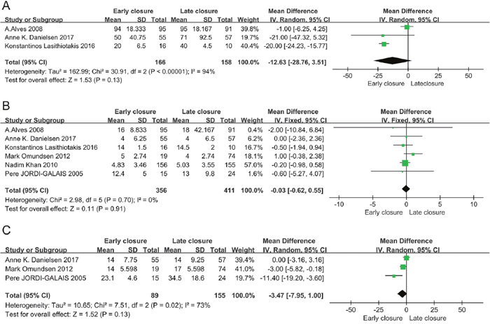 All three trials [13, 14, 33] reported operative time in 324 patients, and the late closure group appeared to need a slightly longer operative time. However, a meta-analysis using the random effects model found no significant difference in the operative time between the early and late closure groups [weighted mean difference (WMD) 12.63 min shorter in the early closure group, 95%CI: −28.76–3.51; p = 0.13] (Figure 3A). Statistical heterogeneity was found (τ2 = 162.99, χ2 = 30.91; p< 0.00001, I2 = 94%).