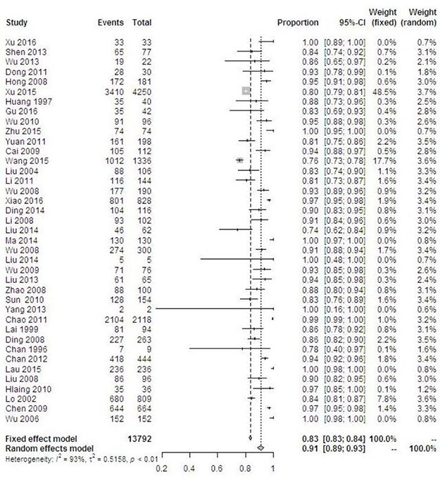 A total of 30,165 women were HPV-positive. Overall HPV prevalence increased with the degree of cervical disease severity from 24.8% in normal cervices to 87.7% in ICC (P < 0.001) (Table 1). The pooled prevalence of overall HPV types among women with ICC was 91.1% (95% CI 88.7–93.1%) and displayed significant heterogeneity, I2 = 93.2%, P < 0.0001 (Figure 3). Differences in the HPV positivity rate by geographical region varied obviously among pathological categories. In normal cervices, the overall HPV prevalence varied substantially by region, ranging from approximately 10% in Taiwan/Hong Kong to more than 20% in mainland China. For ICC, the overall HPV prevalence was consistent (more than 95%) in Taiwan, Hong Kong, and Macao but ranged from 77.5% to 92.9% and yielded an average of 83.7% (95% CI 82.9–88.2%) in mainland China. The overall HPV prevalence rates in SCC, ADC and unspecified ICC were 86.9% (5840/6721), 71.5% (459/642) and 90.1% (5795/6429), respectively.