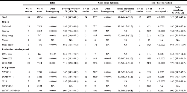 Table 2: Meta-analysis of the HPV prevalence in women with ICC, stratified by HPV DNA source, across region, publication calendar period, and PCR primers