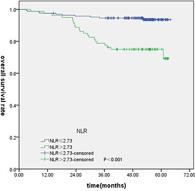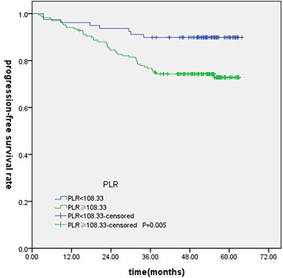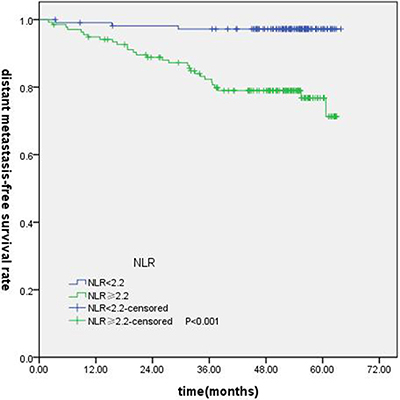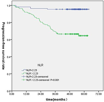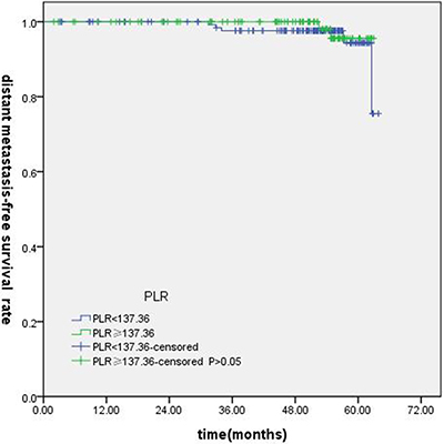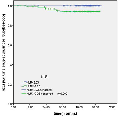 The optimum cut-point values of the preoperative NLR and PLR for survival prediction were determined through receiver operating characteristic curve (ROC) curve analysis. When overall survival (OS) was used to an end point for NLR and PLR, the areas under the curve (AUC) for NLR and PLR were 0.720 (P < 0.001), 0.579 (P = 0.148), respectively . The cutoff values of NLR was 2.73 (sensitivity, 67.74%; specificity, 72.96%). Subsequently, PLR was excluded because of the small AUC (P > 0.05). When using progression-free survival (PFS) as an end point, the cut-off values were 2.19 (sensitivity, 87.50%; specificity, 51.76%, P < 0.001), 108.33 (sensitivity, 85.42%; specificity, 36.18%, P = 0.013), respectively. The NLR and PLR cutoff values for distant metastasis-free survival (DMFS) were 2.20 (sensitivity, 87.10%; specificity, 49.10%, P < 0.001) and 137.36 (sensitivity, 64.5%; specificity, 61.1%, P = 0.026). When loco-regional recurrence-free survival (LRFS) as an end point for NLR and PLR, the AUC for NLR and PLR were 0.648 (P < 0.001), 0.603 (P = 0.213), respectively. The cut-off values of NLR was 2.23. All of the cases were divided into two groups, the high groups greater than or equal to the cut-off values,the low groups less than the cutoff values.
