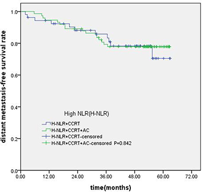 In our study, all of the 247 patients received IMRT, 91% patients received concurrent chemotherapy, 21 (8.5%) patients added targeted drugs ( cetuximab or nimotuzumab), 122 (49.4%) patients received adjuactive chemotherapy. Nonetheless, there were some heterogeneities in the treatment of NPC patients, but In the 247 included cases, 223 (90.3%) patients were III-IVa stage, our previous study had confirmed that there had no survival benefit for locally advanced NPC received addition adjuvant chemotherapy followed concurrent radiotherapy [37]. In the subgroup analysis, we found that compared with concurrent radiochemotherapy, adjuvant chemotherapy had no significantly improved survival for patients with high NLR. The standard treatment method for NPC is concurrent chemoradiotherapy, previous research [38] confirmed that concurrent chemoradiotherapy plus adjuvant chemotherapy can improved OS, Joseph also verified the similar results. Therefore, the concurrent chemoradiotherapy plus adjuvant chemotherapy became a standard method for locally advanced NPC. However, a recent meta analysis showed that addition adjuvant chemotherapy does not improve survival. [39] Most of these researches were based on conventional radiotherapy yet. However, this is a ear of IMRT, IMRT has shown remarkable benefits in local control and non-recurrence survival for patients, the role of adjuvant chemotherapy was controversial. Ladan [40] found that the value of additional adjuvant chemotherapy appears to be limited. The resaerch of chen showed concurrent chemoradiotherapy with cisplatin and fluorouracil adjuvant chemotherapy did not improve PFS in locally advanced NPC patients [41]. Resaercher had begain to pay attention to who could benefit from adjuvant chemotherapy. Zhong [42] reported concurrent chemo-IMRT with adjuvant chemotherapy might improved OS, especially for III-IVa and T4 patients. Liang [37] found that patients with N2-3 disease might benefit from the addition of adjuvant chemotherapy. In our analysis, we found that compared with concurrent radiochemotherapy, adjuvant chemotherapy had no significantly improved survival for patients with high NLR. For locally advanced NPC, NLR might not be a useful indicator for selection of treatment strategies.
