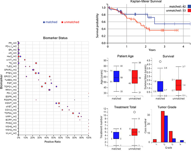 Figure 3: Plots of biomarker statuses, survival, and patient and tumor characteristics. Left: biomarker statuses in the treatment groups, where the size of the circle indicates the number of cases. Top-right: A Kaplan–Meier curve of overall survival from time of profiling, comparing treatment groups. Middle-right to lower-right: a summary of patient ages, survival time, treatment numbers, and grade of samples. Blue = matched patients, red = unmatched patients.