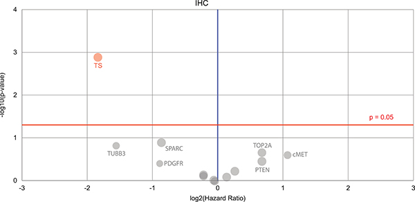 Figure 2: A Volcano plot is shown denoting the biomarkers’ prognostic value. Only one biomarker of significance is found (on the top left), the immunohistochemistry thymidylate synthase (TS) marker. Red circle = the hazard rate of a positive biomarker result is significantly higher than that of a negative biomarker result, gray = the difference between a positive biomarker result and a negative biomarker result is not significant. Red line = significance threshold.