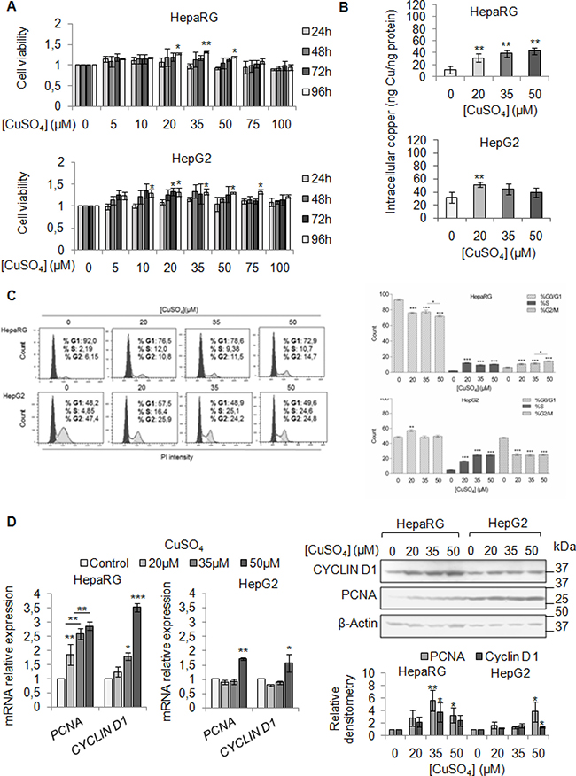 Figure 2: Copper promotes cell proliferation in liver cells. (A) Relative cell viability evaluated by MTS assay. Relative cell viability of treated cells has been evaluated respect to untreated cells, considered as 0. The results, derived from five independent experiments, are represented as mean ± SD. (B) Intracellular copper levels assayed by atomic absorption spectroscopy after 96 hrs of 20, 35 and 50 μM CuSO4 treatment. Values are expressed as mean ± SD. (*P < 0.05 and **P < 0.01; n = 5). (C) Left: Representative distribution of control and treated cells with CuSO4 (in serum free medium) in G0/G1, S and G2/M phases of cell cycle done by Propidium Iodide (PI) staining and flow cytometric analysis. Right: Histograms reported the values as mean ± SD. (*P < 0.05; **P < 0.01; ***P < 0.001; n = 3). (D) Relative mRNA expression (Left), representative western blot (Top, Right) and the relative densitomentric analysis (Bottom, Right) of PCNA and Cyclin D1 in Control and copper treated cells. Values are expressed as mean ± SD. (*P < 0.05 and **P < 0.01; n = 3).