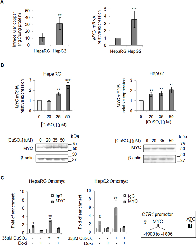 Figure 3: Direct interaction between MYC and CTR1. (A) Left: Basal intracellular copper levels assayed by atomic absorption spectroscopy in HepaRg and HepG2 cells. Right: relative mRNA expression of MYC in HepG2 and HepaRG cells. Values are expressed as mean ± SD. (**P < 0.01 and ***P < 0.001; n = 5). (B) Relative mRNA expression and representative western blots of MYC in HepaRG (Left) and HepG2 (Right) cells after 20, 35 and 50 μM CuSO4 treatment (96 hrs). Values are expressed as fold mean ± SD. (**P < 0.01; n = 3). (C) MYC binding to the CTR1 promoter region, assayed by ChIP, after induction of Omomyc by doxycyclin (Doxi), before and after treatment with 35 μM CuSO4 (96 hrs). Values are expressed as fold mean ± SD of three independent experiments (*P < 0.05 and **P < 0.01). IgG was used as negative ChIP control. Right: Schematic representation of the MYC binding consensus sequences on the CTR1 promoter.