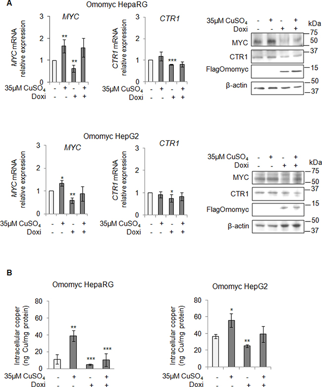 Figure 5: MYC modulates the intracellular copper homeostasis. (A) Relative mRNA expression (Left) and representative western blots (Right) of MYC, CTR1 and FlagOmomyc in Omomyc HepaRG (Top) and HepG2 (Bottom) cells before and after induction of Omomyc by doxycyclin (Doxi), treated or not with 35 μM CuSO4 (96 hrs). Values are expressed as fold mean ± SD. (*P < 0.05; **P < 0.01 and ***P < 0.001; n = 3). (B) Intracellular copper levels in Omomyc HepaRG (Left) and HepG2 (Right) cells in the same experimental condition described above. Values are expressed as fold mean ± SD. (*P < 0.05; **P < 0.01 and ***P < 0.001; n = 3).