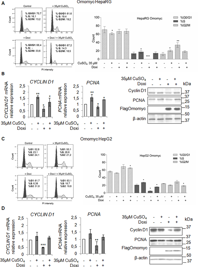 Figure 6: Omomyc and copper-induced proliferation. (A and C) Left: Representative distribution plot of HepaRG (A) and HepG2 (C), after induction of Omomyc by doxycyclin (Doxi), before and after treatment with 35 μM CuSO4 (96 hrs), in G0/G1, S and G2/M phases of the cell cycle analysed by PI staining and flow cytometric analysis. Right: Histograms reported values as mean ± SD (*P < 0.05; **P < 0.01; ***P < 0.001; n = 3). (B and D) Relative mRNA expression (Left) and representative western blots (Right) of Cyclin D1, PCNA and FlagOmomyc in HepaRG (B) and HepG2 (D) cells in the same experimental condition described above (*P < 0.05; **P < 0.01; ***P < 0.001; n = 3).