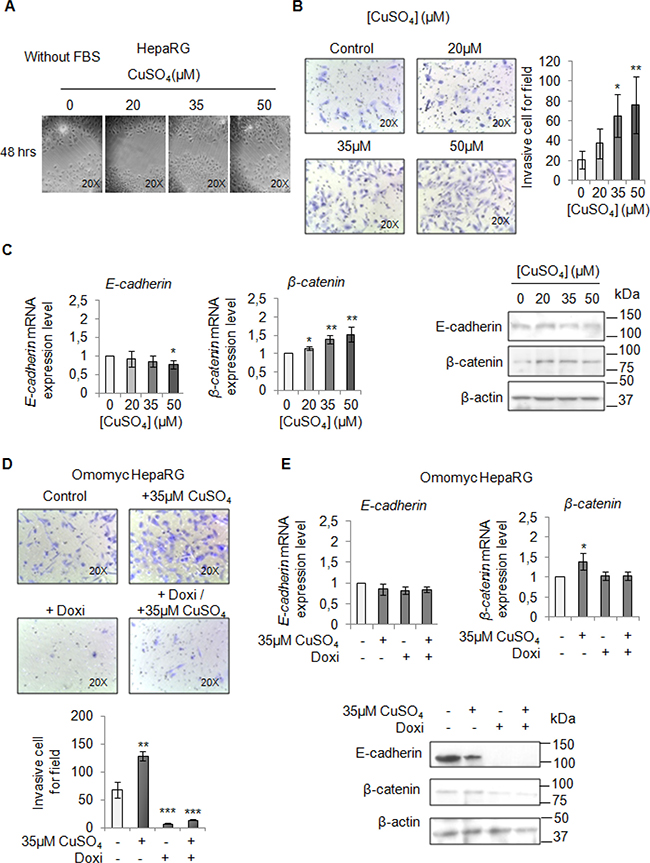 Figure 7: Copper promotes HepaRG invasion by MYC. (A) Analysis of cell migration by a wound-healing assay in control and CuSO4 treated HepaRG cells. Representative microphotographs taken at 48 hrs post-wound (×20). (B) Transwell migration assay in HepaRG cells treated with copper for 48 hrs, in serum free medium. Left: Representative microphotographs of crystal violet stained cells migrated to the bottom membrane of transwell (×20). Right: Quantification of the number of migratory cells, that were counted in 5 non-overlapping random fields of the membrane. Values are expressed as fold mean ± SD. (*P < 0.05 and **P < 0.01; n = 3). (C) Relative mRNA expression (Left) and representative western blots (Right) of E-cadherin and β-catenin in HepaRG treated with CuSO4 up to 96 hrs. Values are expressed as fold mean ± SD. (*P < 0.05; n = 3). (D) Transwell migration assay in Omomyc HepaRG cells performed in a serum-supplemented medium, after induction of Omomyc by doxycyclin (Doxi), before and after treatment with 35 μM CuSO4 (48 hrs). Top: Representative microphotographs of crystal violet stained cells attached to the bottom membrane of a transwell (×20). Bottom: Quantification of the number of migratory cells using the transwell assay. Migratory cells were counted in five non-overlapping random fields of the membrane. Values are expressed as fold mean ± SD. (*P < 0.05 and ***P < 0.001; n = 3). (E) Relative mRNA expression (Top) and representative western blots (Bottom) of E-cadherin and β-catenin in Omomyc HepaRG cells treated or not with copper treatment (96 hrs). Values are expressed as fold mean ± SD (*P < 0.05; n = 3).