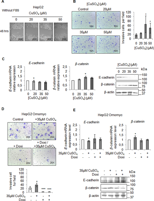 Figure 8: Copper induces HepG2 migration by MYC. (A) Analysis of cell migration by a wound-healing assay in Control and CuSO4 treated HepG2 cells. Representative microphotographs taken at 48 hrs post-wound (×20). (B) Transwell migration assay in HepG2 cells treated with copper for 48 hrs in serum free medium. Left: Representative microphotographs of crystal violet stained cells attached to the bottom membrane of a transwell (×20). Right: Quantification of the number of migratory cells, that were counted in five non-overlapping random fields of the membrane. Values are expressed as fold mean ± SD. (*P < 0.05; n = 3). (C) Relative mRNA expression (Left) and representative western blots (Right) of E-cadherin and β-catenin in HepG2 treated with CuSO4 for 96 hrs. Values are expressed as fold mean ± SD. (*P < 0.05; n = 3). (D) Transwell migration assay in HepG2 Omomyc cells in a serum-supplemented medium, after induction of Omomyc by doxycyclin (Doxi), before and after treatment with 35 μM CuSO4 (48 hrs). Top: Representative microphotographs of crystal violet stained cells attached to the bottom membrane of a transwell (×20). Bottom: Quantification of the number of migratory cells, that were counted in five non-overlapping random fields of the membrane. Values are expressed as fold mean ± SD. (*P < 0.05 and ***P < 0.001; n = 3). (E) Relative mRNA expression (Top) and representative western blots (Bottom) of E-cadherin and β-catenin in HepG2 Omomyc inducing cells in presence or not of copper treatment for 96 hrs. Values are expressed as fold mean ± SD (*P < 0.05; n = 3).