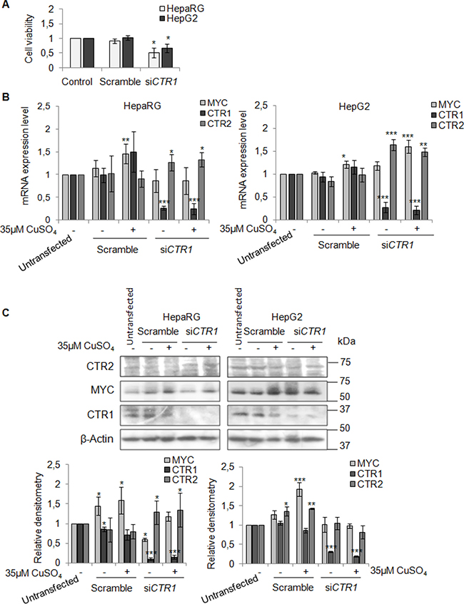 To better understand the involvement of CTR1 in copper/MYC axis we transfected HepaRG and HepG2 cells with a pool of CTR1 siRNAs (siCTR1). As shown in Figure 9 siCTR1 specifically inhibited CTR1 expression, in presence or absence of 35 μM CuSO4. Copper transporter 2 protein, CTR2, was used as control.