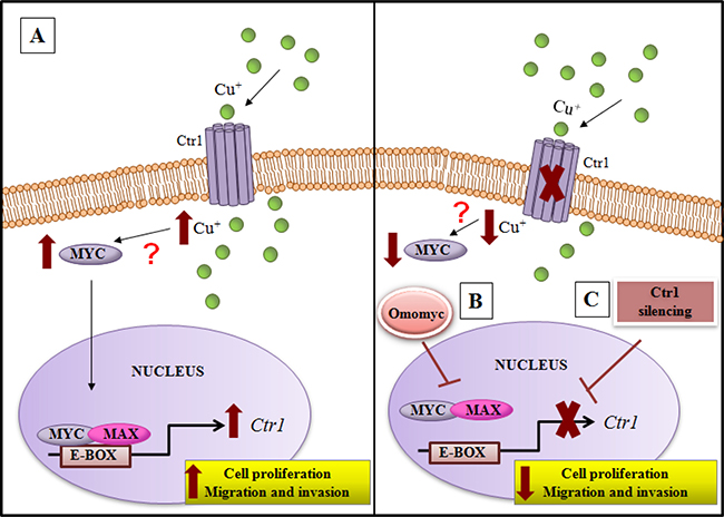 We highlighted, for the first time, that an interplay between copper and MYC exists, underscoring the ability of copper in inducing MYC expression (Figure 3B). Moreover, we demonstrated that MYC binds a specific consensus region on CTR1 promoter (Figure 3C), the principal copper transporter protein. Exploiting the anti-proliferative and anti-invasive efficacy of Omomyc (Figures 6, 7 and 8), a MYC dominant negative that inhibits the MYC/MAX interaction, we highlighted that MYC/MAX dimer is necessary for the transcription of CTR1, influencing, in this way, intracellular copper levels (Figure 5A and 5B). A schematic regulatory model of copper/MYC/CTR1 axis was proposed in Figure 11.