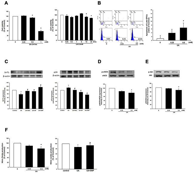 Figure 2: Effects of uric acid on EPC viability, apoptosis, NO production, eNOS and Akt phosphorylation. (A) EPC viability was analyzed by MTT assay. EPC viability was compared when cultured at different concentrations of uric acid (0, 5, 10, and 20 mg/dL) for 24 hr. and in a high-level uric acid concentration (10 mg/dL) was followed at different time points. (B) EPC apoptosis was detected by annexin V assay using flow cytometry. EPC apoptosis was compared at different uric acid concentrations (0, 5, 10 mg/dL). (C) Expression of sirT1 and p16 protein levels. (D) Expression of phosphorylated eNOS. (E) and phosphorylated Akt protein levels. (F) NO production was assessed by staining with a NO fluorescent indicator (DAF-FM). NO production was assessed in the high-level uric acid by the presence of SNP. SNP: S-nitroso-N-acetyl-D, L-penicillamine, a NO-donor. Data are mean ± SEM; n=4; * P < 0.05 versus control; # P < 0.05 versus high-level uric acid (UA).