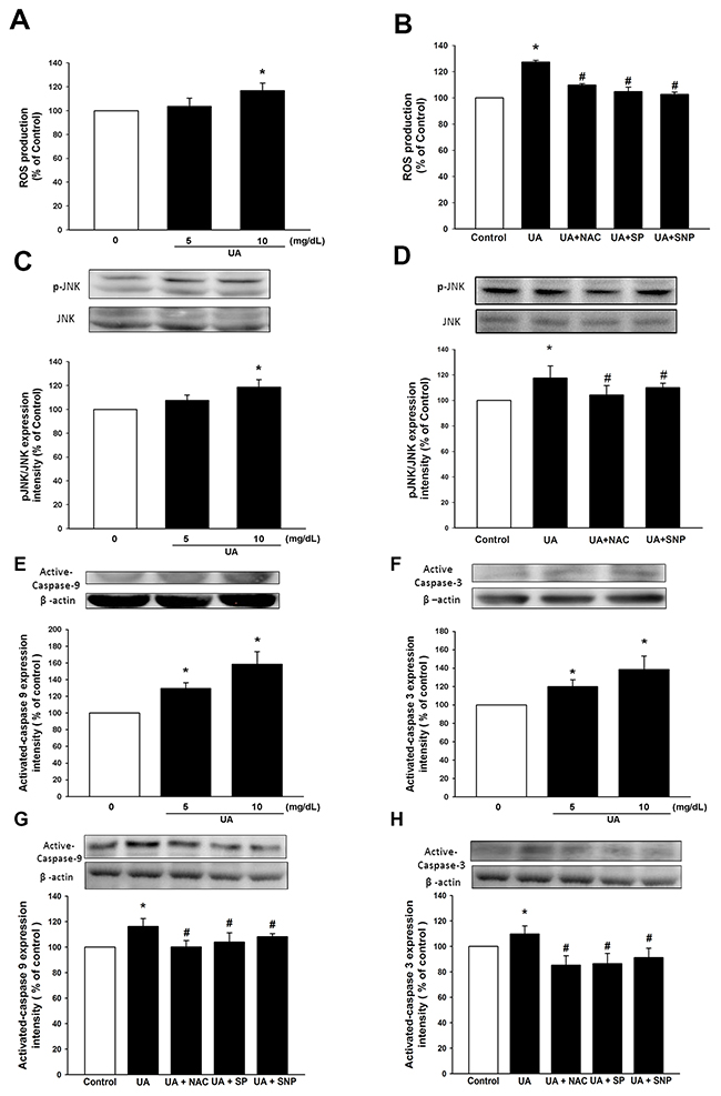 Figure 3: Uric acid induces ROS and active caspase 3, 9 through JNK pathway. Cells were cultured and analyzed under different uric acid concentrations (0, 5, 10 mg/dL) and in the absence or presence of SNP (NO donor), NAC (antioxidant) and SP (SP600125, JNK inhibitor). (A, B) ROS production of EPC was assessed by staining with DCFH-DA. (C, D) Expression of JNK phosphorylation protein levels was assessed by western blot analysis. (E, F, G, H) Expression of active caspase-9 and caspase-3 protein levels was assessed by western blot analysis. Data are mean ± SEM; n=4; * P < 0.05 versus control; # P < 0.05 versus high-level uric acid (10 mg/dL).