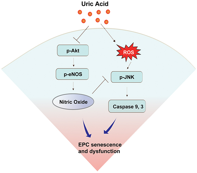 Figure 6: Schematic diagram summarizing possible mechanisms by which uric acid induces endothelial progenitor cell (EPC) damage. Uric acid resulted in the impairment of EPC function by down-regulation of the Akt/eNOS/NO pathway and up-regulation of caspase 3 and caspase 9 through the JNK pathway.