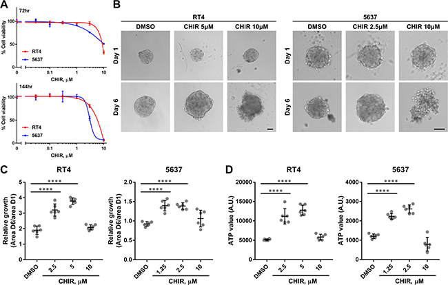 For viability assay in adherent culture, 3000 and 1500 cells of RT4 and 5637 were seeded in a 96-well tissue-treated plate in triplicate, respectively. Twenty-four hours after seeding, cells were treated with DMSO or CHIR for 72 or 144 hours. Cell viability was then measured using CellTiter-Glo Luminescent Cell Viability Assay (Promega) and FLUOstar OPTIMA (BMG Labtech) according to manufactures’ protocols. Following this, dose response curves of CHIR were depicted using GraphPad Prism 7 (GraphPad Sofrware, San Diego, CA, US) with non-linear (curve fit) regression algorithms.