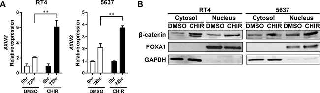 Figure 2: CHIR activates Wnt/β-catenin pathway in bladder cancer cell line-derived organoids. (A) Bar graphs show the relative gene expression of AXIN2 by qRT-PCR in RT4- and 5637-derived organoids treated for 72 hours with DMSO or CHIR of 5 and 2.5 μM for RT4 and 5637, respectively. GAPDH was used as a reference gene, and relative expression was calculated by the 2 ΔΔCT method. **P ≤ 0.01. (B) Western blot analysis shows protein levels of β-catenin, FOXA1, and GAPDH in RT4- and 5637-derived organoids. Organoids were treated for 24 hours with DMSO or CHIR of 5 and 2.5 μM for RT4 and 5637, respectively. Cytoplasmic and nuclear proteins were separated and analyzed. GAPDH and FOXA1 were used as a loading control for cytoplasmic and nuclear protein, respectively.