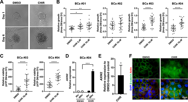 Figure 3: CHIR enhances proliferation of primary bladder cancer cells in organoid culture with activation of Wnt/β-catenin pathway. (A) Representative images of primary cell organoids (BCa #01) at day 1 and day 6 treated with DMSO or CHIR of 10 μM. Scale bar, 100 μm. (B) Relative growth of organoids from 4 patient samples was calculated by dividing area at day 6 by that at day 1, and depicted in the plot. (C) Relative viability of organoids from 2 patient samples was measured by dividing the amount of ATP at day 6 by the area of organoid at day 1, and depicted in the plot. Each dot represents relative growth or viability of one organoid. (D) Bar graphs show the relative gene expression of AXIN2 by qRT-PCR in primary cell organoids (BCa #04) treated with DMSO or CHIR of 10 μM for 96 hours. GAPDH was used as a reference gene, and relative expression was calculated by the 2 ΔΔCT method. (E) A bar graph shows the relative gene expression of AXIN2 by qRT-PCR in primary cell organoids of 3 pooled patient samples (BCa #02, #03, #04). The result was normalized to the expression of DMSO-treated organoids.*P ≤ 0.05. **P ≤ 0.01. ***P ≤ 0.001. ****P ≤ 0.0001. (F) The expression and subcellular localization of β-catenin in primary cell organoids (BCa #04) treated with DMSO or 10 μM CHIR for 72 hours was detected by immunofluorescence staining. Nuclei and actin fibers were counterstained with DAPI and ActinRed, respectively. Scale bar 20 μm.