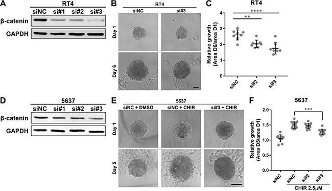 Figure 4: β-catenin is required for growth of bladder cancer organoids. (A, D) Western blot of β-catenin in RT4 and 5637 transiently transfected with siRNAs against β-catenin. Protein was extracted 48 hours after transfection. GAPDH was used as a loading control. NC, negative control. (B) RT4 was transiently transfected with siRNAs and used to generate organoids. Images show representative RT4-derived organoids after transfection at day 1 and 6. Scale bar, 100 μm. (C) Relative growth of RT4-derived organoids after transfection was quantified and plotted. (E) 5637 was transiently transfected with siRNAs and used to generate organoids. The organoids were subsequently treated with 2.5 μM of CHIR. Images show representative 5637-derived organoids after transfection and treatment at day 1 and 5. Scale bar, 100 μm. (F) Relative growth of 5637-derived organoids after transfection and treatment was quantified and plotted. Each dot represents relative growth of one organoid. **P ≤ 0.01. ***P ≤ 0.001. ****P ≤ 0.0001.