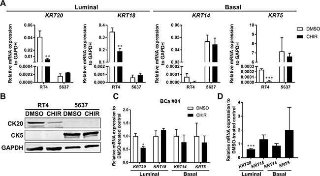 Figure 5: CK20 is less expressed in CHIR-stimulated bladder cancer organoids. (A) qRT-PCR shows mRNA expression of luminal markers (CK20, CK18) and basal markers (CK14, CK5) in RT4- and 5637-derived organoids treated with DMSO or CHIR for 72 hours. GAPDH was used as a reference gene. (B) Western blot analysis demonstrates protein levels of CK20 and CK5 in RT4- and 5637-derived organoids. Organoids were treated for 72 hours with DMSO or CHIR of 5 and 2.5 μM for RT4 and 5637, respectively. GAPDH was used as a loading control. (C) Bar graphs show the relative gene expression of CK20, CK18, CK14, and CK5 by qRT-PCR in primary cell organoids (BCa #04) treated with DMSO or CHIR of 10 μM for 96 hours. GAPDH was used as a reference gene, and relative expression was calculated by the 2 ΔΔCT method. (D) Bar graphs show the relative gene expression of CK20, CK18, CK14, and CK5 by qRT-PCR in primary cell organoids of 3 pooled patient samples (BCa #02, #03, #04). The results were normalized to the expression of DMSO-treated organoids. *P ≤ 0.05. **P ≤ 0.01. ***P ≤ 0.001.