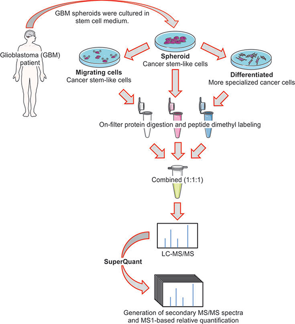 Figure 1: Experimental setup. Glioblastoma stem cell-like spheroids were cultured using the serum-free medium to maintain the stem-like phenotype. Migrating cancer stem-like cells (CSCs) were selected from CSC spheroids using the migration assay reported previously and represented in Supplementary Figure 1. Differentiated cells were obtained by culturing CSC spheroids in medium containing 10% (w/v) fetal calf serum. After cell lysis and on-filter protein digestion, peptides were labeled with dimethyl labeling. SuperQuant was used to increase quantitative proteome coverage.