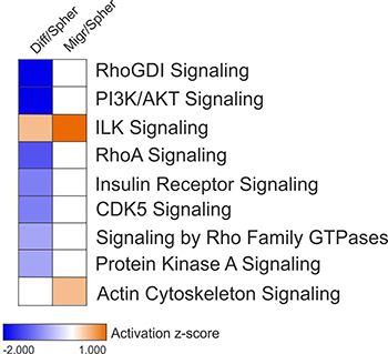 Figure 3: Modulation of canonical signaling pathways in migrating CSCs and differentiated cells. Activation z-score for top-scoring canonical pathways from differentiated cells (left column) and migrating CSCs (right column). Positive values for activation z-score are in orange and denote activation. Negative values for activation z-score are in blue and indicate inhibition. Z-scores equal or very close to zero are in white and indicate no modulation. Not-defined z-score values are also in white.