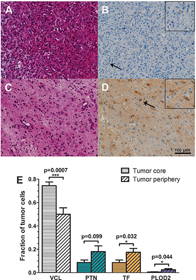 Immunohistochemical staining was performed on tissue samples matching the patient from whom T78 was derived. Briefly, formaldehyde fixed and paraffin embedded tissue was cut into 3 μm serial cut sections and placed on glass slides. The first section was stained with haematoxylin-eosin to define tumor core and tumor periphery. Four sections were dewaxed, and heat-induced epitope retrieval followed by quenching of endogen peroxidase was performed. Sections were then incubated with primary antibodies against vinculin (VCL) (1 + 800), procollagen-lysine, 2-oxoglutarate 5-dioxygenase 2 (PLOD2) (1 + 200), pleiotrophin (PTN) (1 + 400), and transferrin (TF) (1 + 800). Detection and staining procedures were done using EnVision (Dako) and the AutostainerPlus (Dako), respectively.
