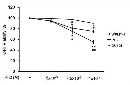 Figure 1: Cell viability assay showing the inhibitory effect of Rh2 on DU145 cell viability. DU145 cells were incubated with Rh2 (5 × 10–5 to 1 × 10–4 M) for 24 h. Human prostate cancer PC-3 cells and prostate stromal myofibroblast cell WPMY-1 were used as controls. Rh2 significantly reduced cell viability of DU145 and PC-3 cells in a concentration-dependent manner but not the WPMY-1 cell. The data are expressed as the means ± S.E.M. (n = 8 for each group). *P < 0.05 and **P < 0.01 compared with control DU145 cells; #P < 0.05 and ##P < 0.01 compared with WPMY-1 cells treated with Rh2.