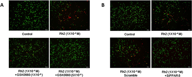 Figure 2: Live/dead cell staining showing GSK0660 and siRNA inhibition on Rh2 apoptotic effect. DU145 cells were incubated with Rh2 (1 × 10–4 M) with/without GSK0060 (1–5 × 10–6 M) for 24 h or transfected with PPAR-delta siRNA 48 h prior to Rh2 treatment. Live cells were stained green, whereas dead cells are stained red. (A) Co-incubation with GSK0660 (1–5 × 10–6 M) inhibited the Rh2 apoptotic effect. (B) PPAR-delta siRNA (SiPPARδ) but not scramble siRNA (Scramble) inhibited the Rh2 apoptotic effect on DU145 cells.