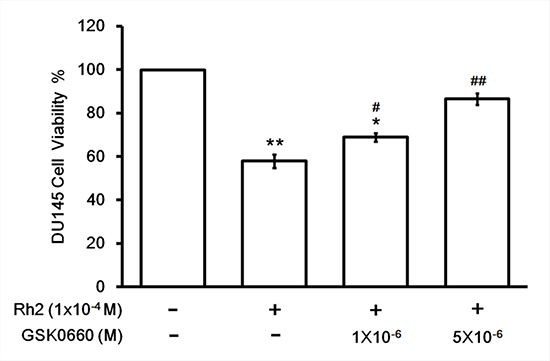 Figure 3: Cell viability assay showing GSK0660 inhibition on Rh2 apoptotic effect. DU145 cells were incubated with Rh2 (1 × 10–4 M) with/without GSK0060 (1–5 × 10–6 M) for 24 hours. The bars depict the quantitative data of cell viability assay on DU145 cells. The data are expressed as the means ± S.E.M. (n = 8 for each group). *P < 0.05 and **P < 0.01 compared with control DU145 cells; #P < 0.05 and ##P < 0.01 compared with DU145 cells treated with Rh2 only.