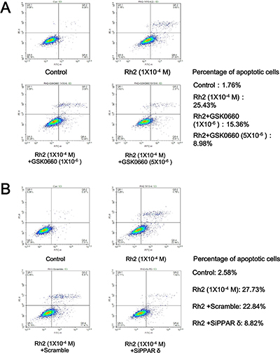 Figure 4: Flow cytometry showing GSK0660 and siRNA inhibition on Rh2 apoptotic effect. DU145 cells were incubated with Rh2 (1 × 10–4 M) with/without GSK0060 (1–5 × 10–6 M) for 24 h or transfected with PPAR-delta siRNA 48 h prior to Rh2 treatment. or PPAR-delta siRNA for 24 hours. (A) Rh2 significantly increased the percentage of apoptotic cells; the effect was inhibited by GSK0660. (B) Rh2 significantly increased the percentage of apoptotic cells; the effect was inhibited by PPAR-delta siRNA (SiPPARδ) but not scramble siRNA (Scramble).
