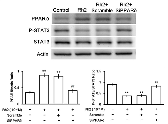 Figure 6: Western blot showing siRNA inhibition on Rh2-induced PPAR-delta and p-STAT3/STAT3 changes. DU145 cells were transfected with PPAR-delta siRNA 48 h prior to incubation with Rh2 (1 × 10–4 M). Rh2 significantly increased PPAR-delta and decreased P-STAT3/STAT3 expression. PPAR-delta siRNA (SiPPARδ) but not scramble siRNA (Scramble) inhibited the Rh2-induced changes. The data are expressed as the means ± S.E.M. (n = 8 for each group). **P < 0.01 compared with control DU145 cells; ##P < 0.01 compared with DU145 cells treated with Rh2 only.