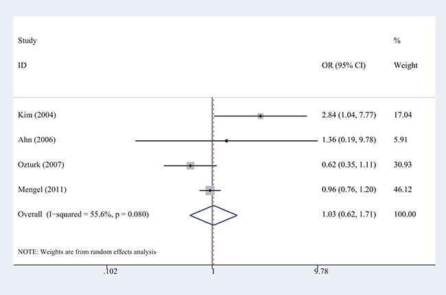 Figure 3: Forest plots of the meta-analysis of the association between AD risk and the CHAT rs3810950 polymorphism among non-ApoE ε4 carriers under the recessive model.