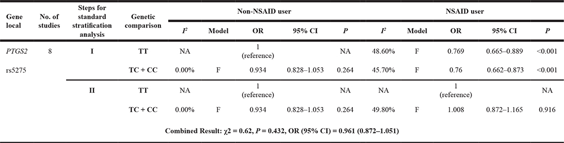 Note: OR: odds ratio; CI: confidence interval; F: fixed-effect model; NA: not available; I: factorial stratification analysis; II: confounder-controlling stratification analysis; PTGS2: prostaglandin endoperoxide synthase 2; NSAID: nonsteroidal anti-inflammatory drug.